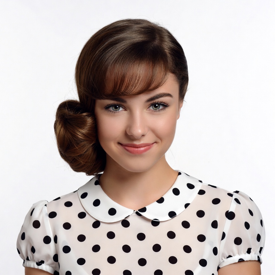 White, brown hair, collared dress, female, hairstyle, headshot, polka dot dress, portrait, puffed sleeves, side bun, smiling, white dress, young woman, woman