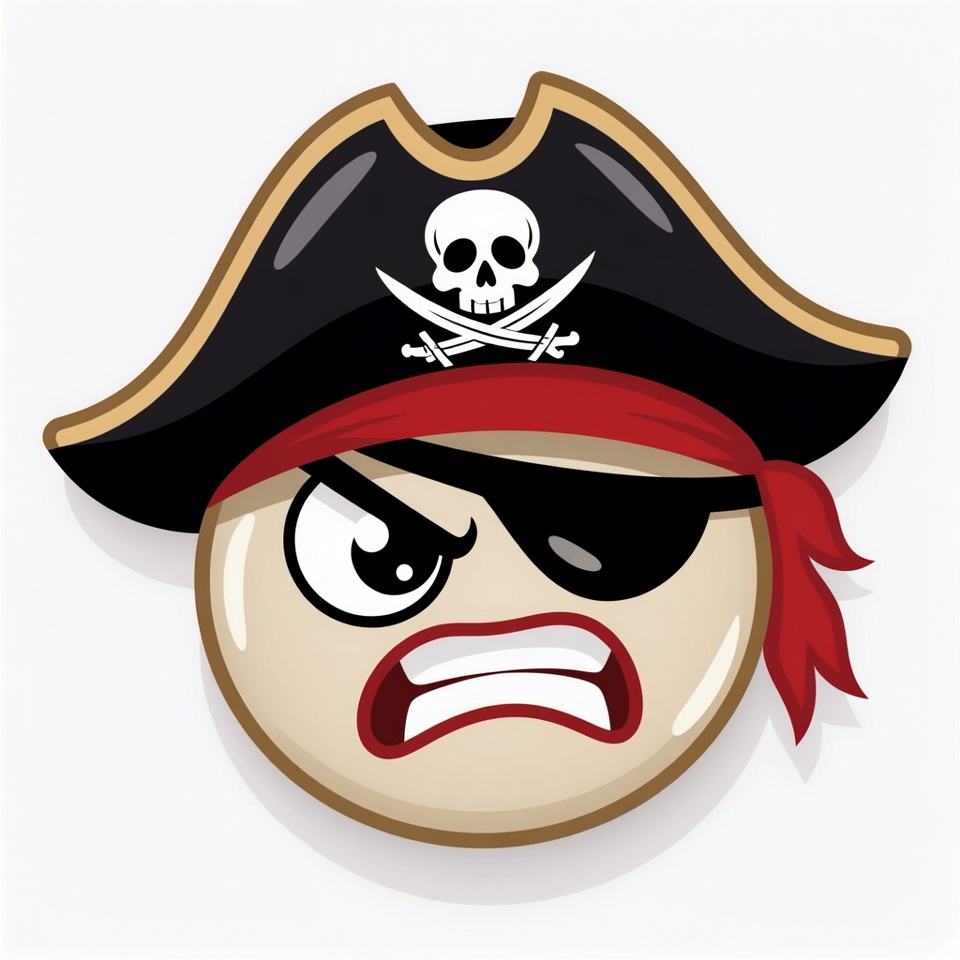 angry expression, angry pirate, bandana, beige face, black hat, cartoon pirate, clipart, emoji, eyepatch, gritted teeth, illustration, isolated background, pirate face, pirate hat, red bandana, round face, skull crossbones, squinted eye, pirate emoji
