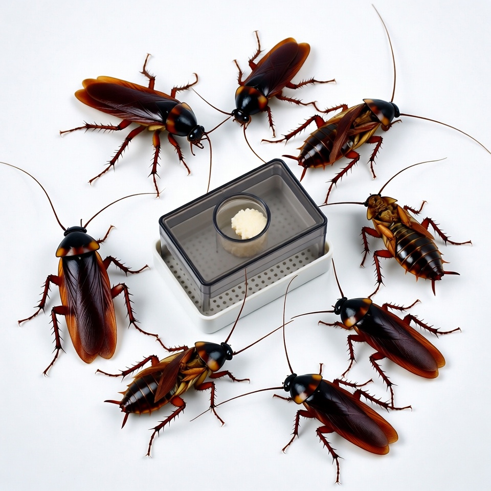 Several realistic toy cockroaches with reddish-brown bodies and long antennae encircle a small transparent plastic bait box on a white background. The bait box contains a white gel-like substance inside. The cockroaches are positioned in a circular formation around the central bait station.