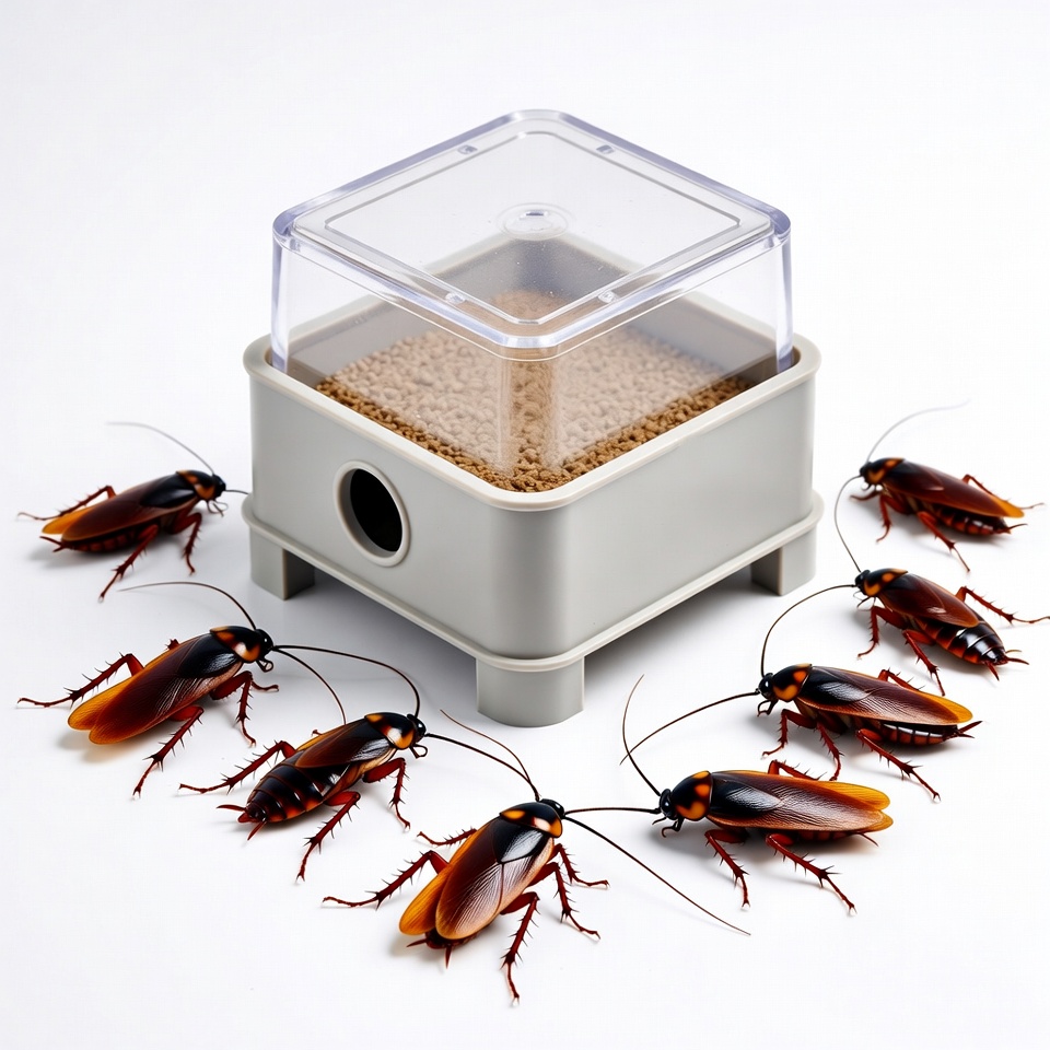 brown food, bug trap, clear lid, entry hole, feeder, granules, gray, insects, isolated, many cockroaches, pests, plastic, product photo, realistic insects, roaches, surrounding, white background, cockroach
