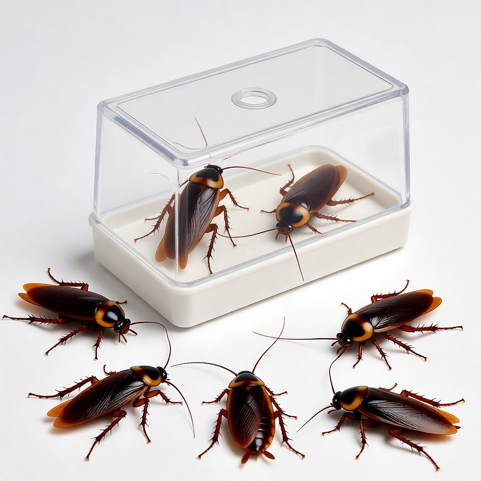 Several realistic plastic cockroaches with brown and yellow markings are placed inside a transparent plastic container on a white tray. Additional toy cockroaches are scattered around the container on a white background. The insects are detailed with shiny exoskeletons and positioned in various poses.