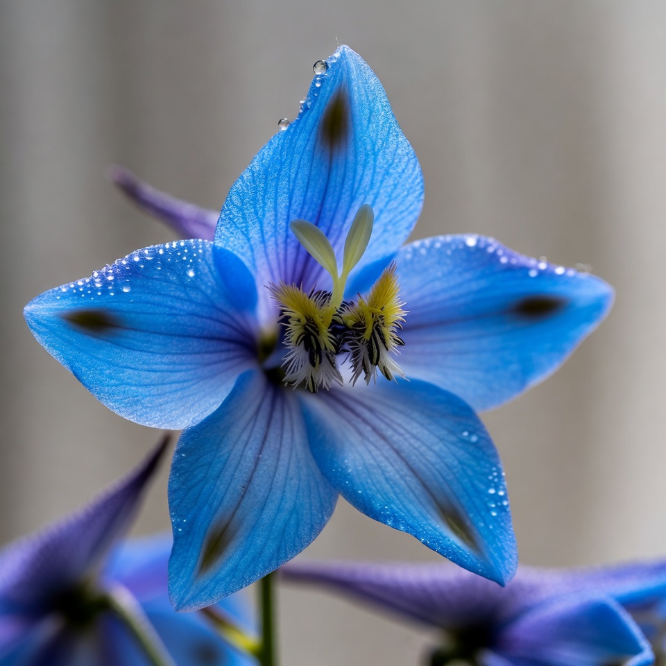 A vibrant blue flower with dark blue markings on its petals stands prominently against a light gray background. Tiny water droplets glisten on the petals and stem. The flower features yellow and white fuzzy stamens at its center.