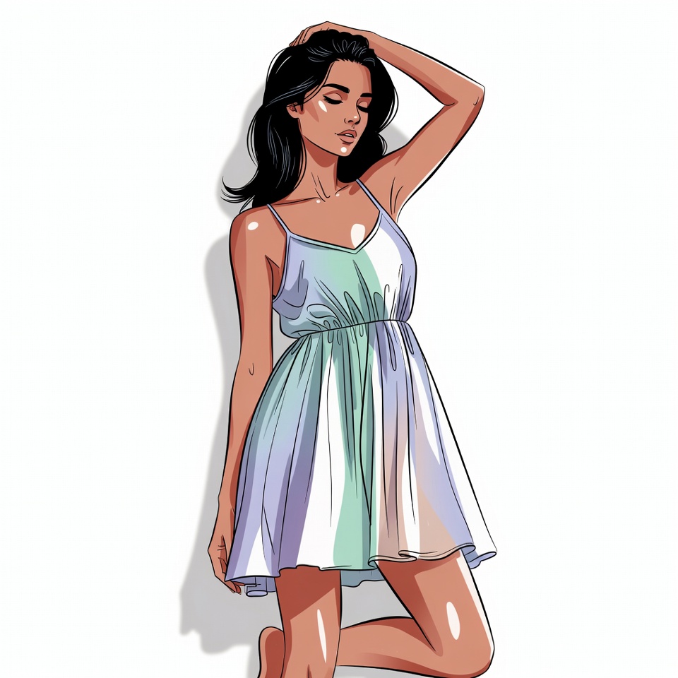 An illustrated woman with long black hair poses sideways on a white background. She wears a sleeveless gradient dress shifting from green to white and lifts one hand to her hair. Her pose features one bent leg and subtle shadows for depth.