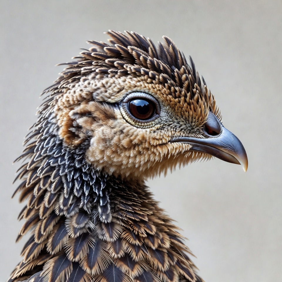A quail faces the camera with detailed brown and black feathers covering its head and neck. Its large dark eye and sharp beak are prominently visible. The bird is set against a plain light gray background.