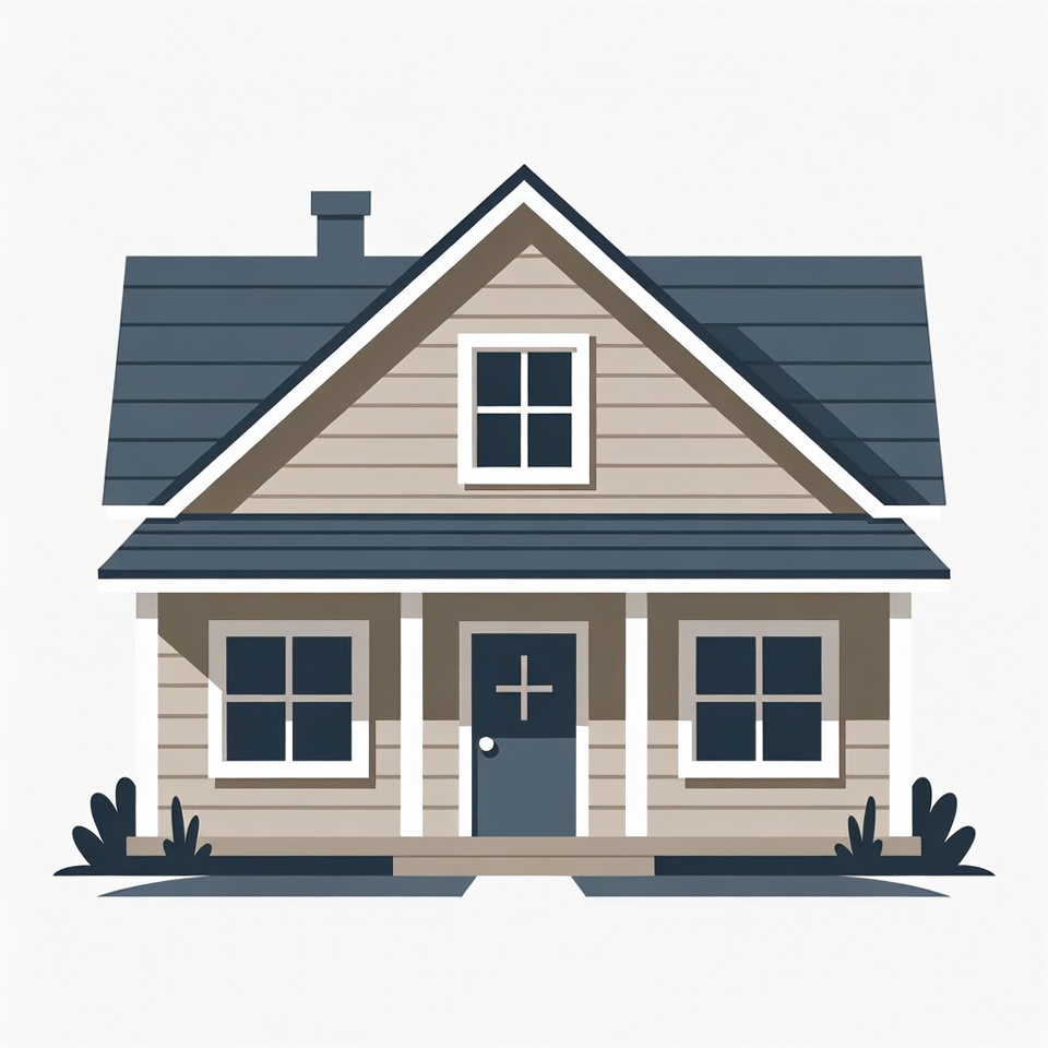 A simple flat illustration of a house features beige siding, a dark blue roof, and a covered front porch. White-framed windows and a door with a cross window are on the facade, accompanied by small green bushes on either side. The house stands isolated against a white background.