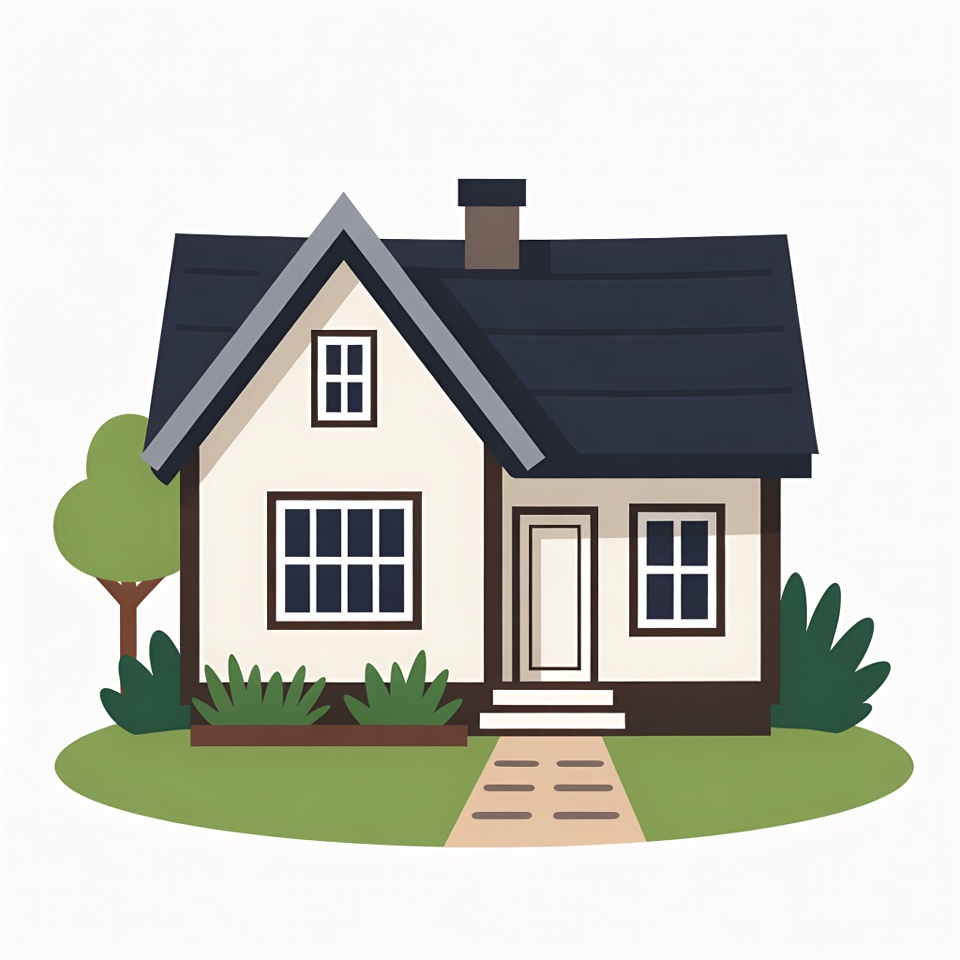 A colorful cartoon illustration of a white house with a dark sloped roof and chimney. It features multiple windows, a front door with steps, and a stone pathway leading to it. The house is surrounded by green grass, bushes, and a tree on an isolated white background.