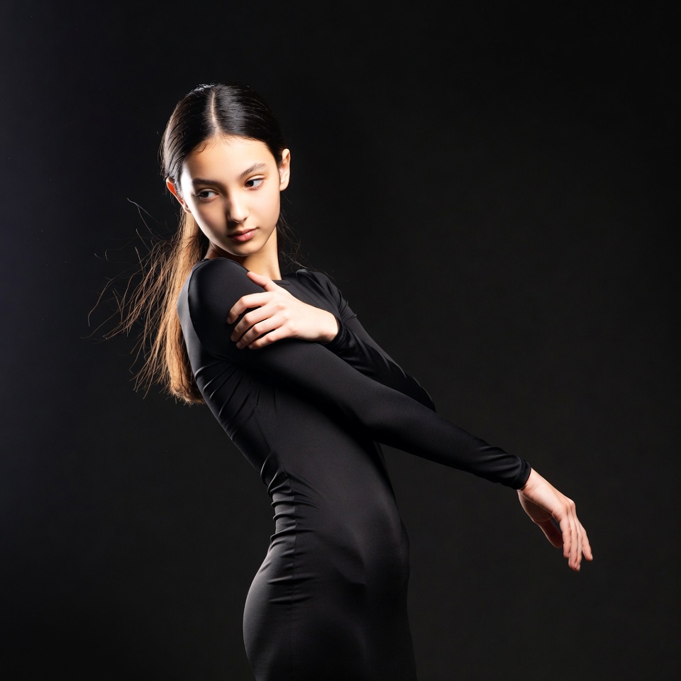 Asian, arms crossed, black bodysuit, dancer pose, dark background, elegant pose, female, isolated background, long hair, posing, profile view, serene expression, straight hair, young girl, girl