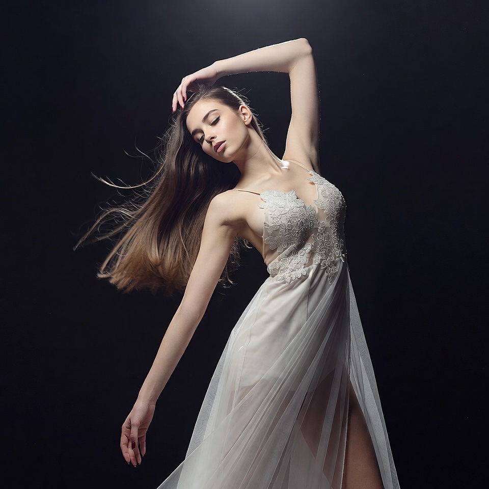 White, black background, brown hair, dynamic pose, elegant, evening gown, fashion, female, flowing hair, lace dress, long hair, model pose, posing, raised arm, sheer dress, slender, studio shot, white dress, young woman, woman