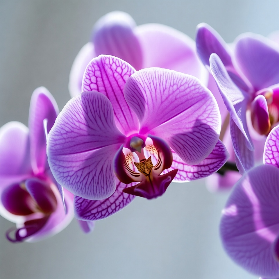 A cluster of vibrant purple Phalaenopsis orchids features detailed veined petals in shades of magenta and lavender. The flowers display striking central columns with yellow accents against a soft blurred gray background. Multiple blooms are captured in close-up, showcasing their intricate textures and elegant form.