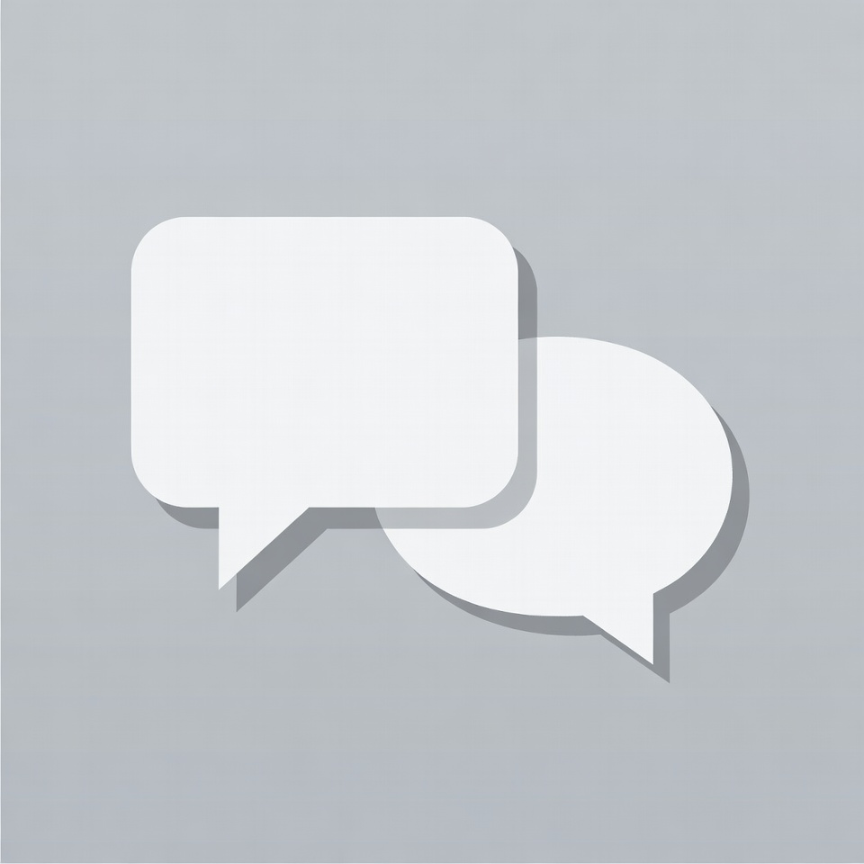 Two white speech bubbles, one rectangular and one oval, overlap slightly on a gray background. Each bubble has a small tail indicating speech direction. The design is flat and minimalist with subtle shadows.