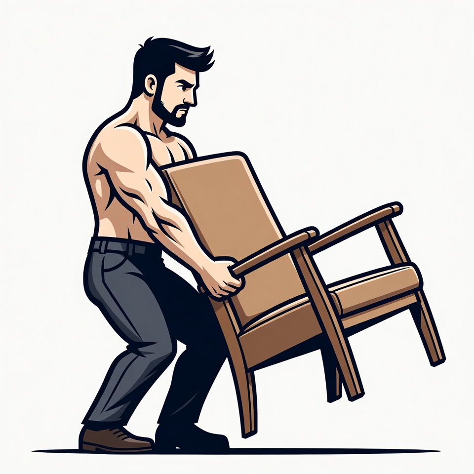 A muscular man with short dark hair and a beard is lifting a wooden armchair with upholstered cushions. He is shirtless, wearing gray pants and brown shoes, straining to carry the chair on an isolated white background. The image is a bold vector illustration.