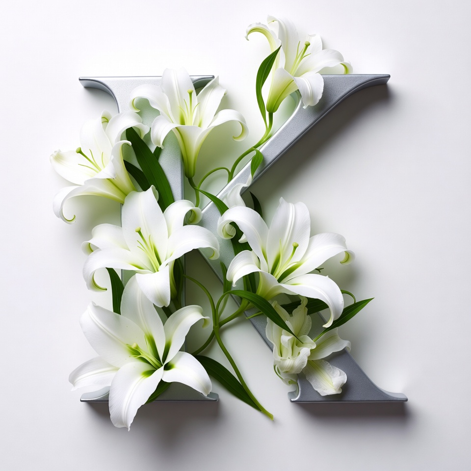 alphabet flowers, floral design, floral letter, flower art, flowers, green leaves, isolated background, letter K, lily arrangement, lily flowers, uppercase K, white background, white flowers, white lilies, lilies
