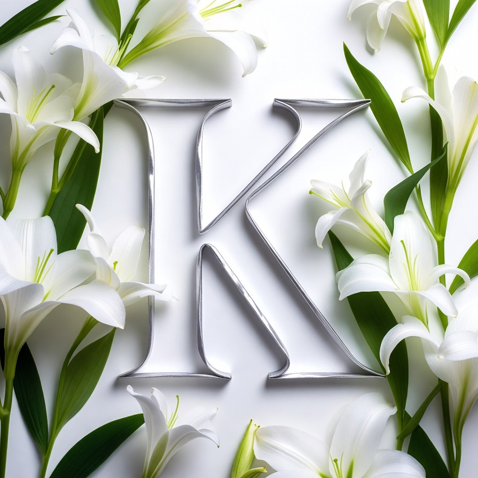 A large metallic silver letter K is centered on a white background, surrounded by clusters of white lilies and green leaves. The lilies feature delicate white petals and prominent yellow stamens. The arrangement is flat lay style with leaves framing the composition.