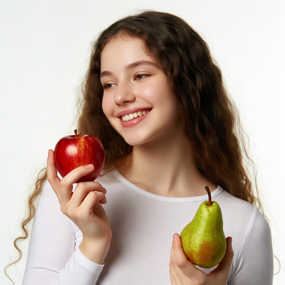A young woman with long curly brown hair holds a red apple in one hand and a green pear in the other. She wears a white long-sleeved top and smiles happily while looking at the fruits. The fruits and woman are centered against a plain white background.