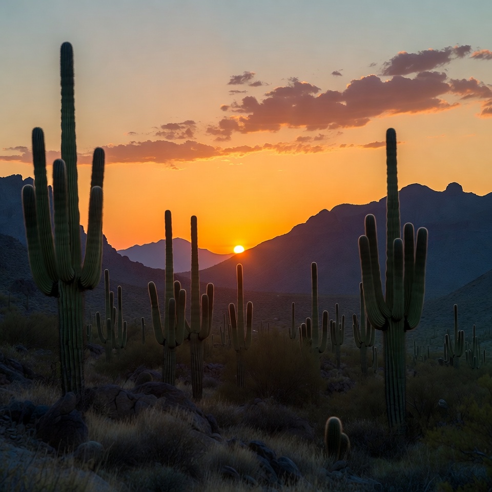 Arizona landscape, Sonoran desert, arid, cacti, clouds, desert, dusk, mountains, nature, orange sky, rocky terrain, silhouette, sunset, vegetation, wilderness, saguaro cactus