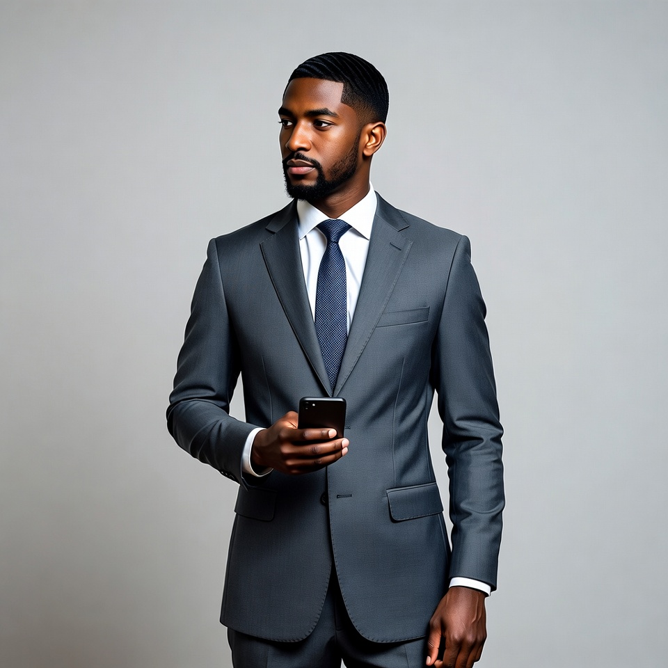 African-American man in suit holding phone