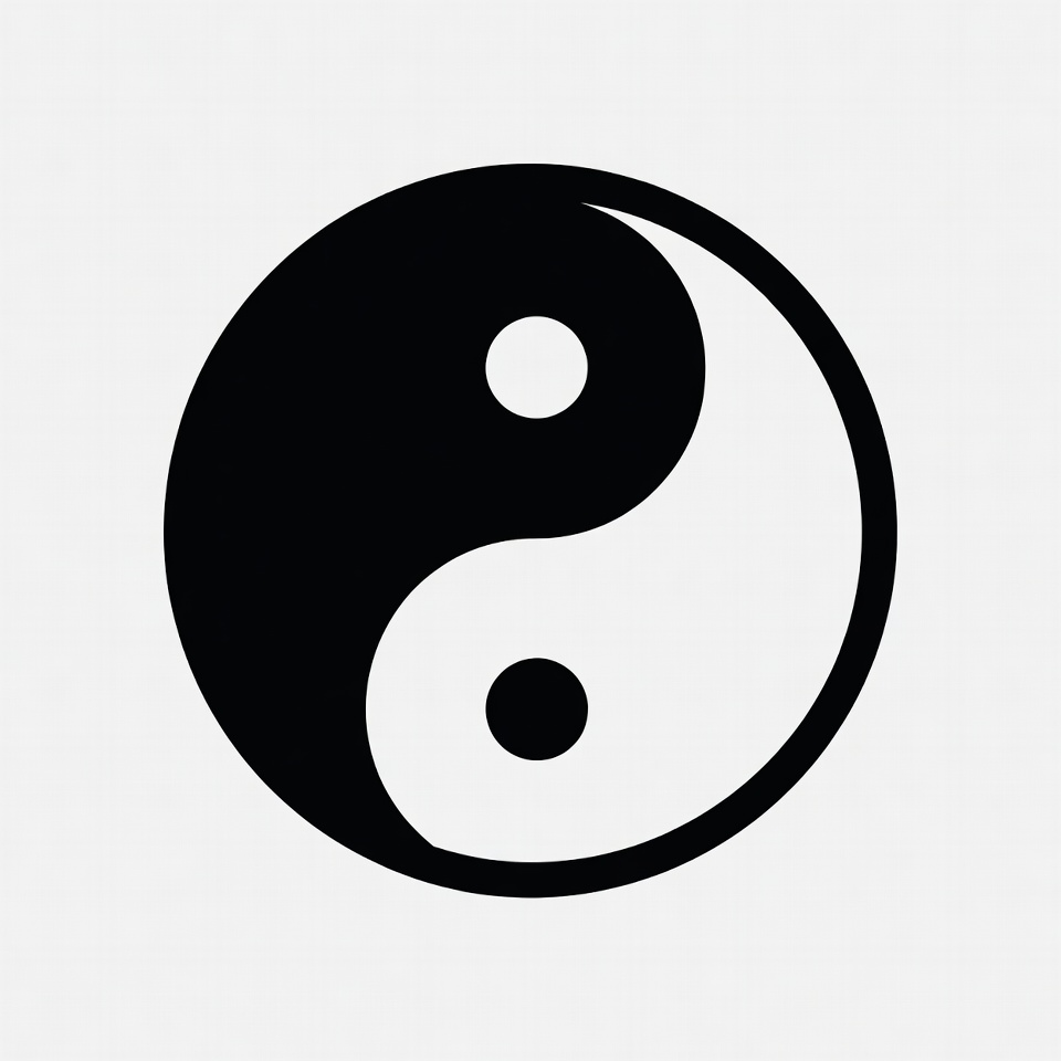 A classic black and white Yin Yang symbol features two interlocking teardrop shapes forming a circle. Each half contains a small dot of the opposite color. The design is simple and isolated on a plain background.