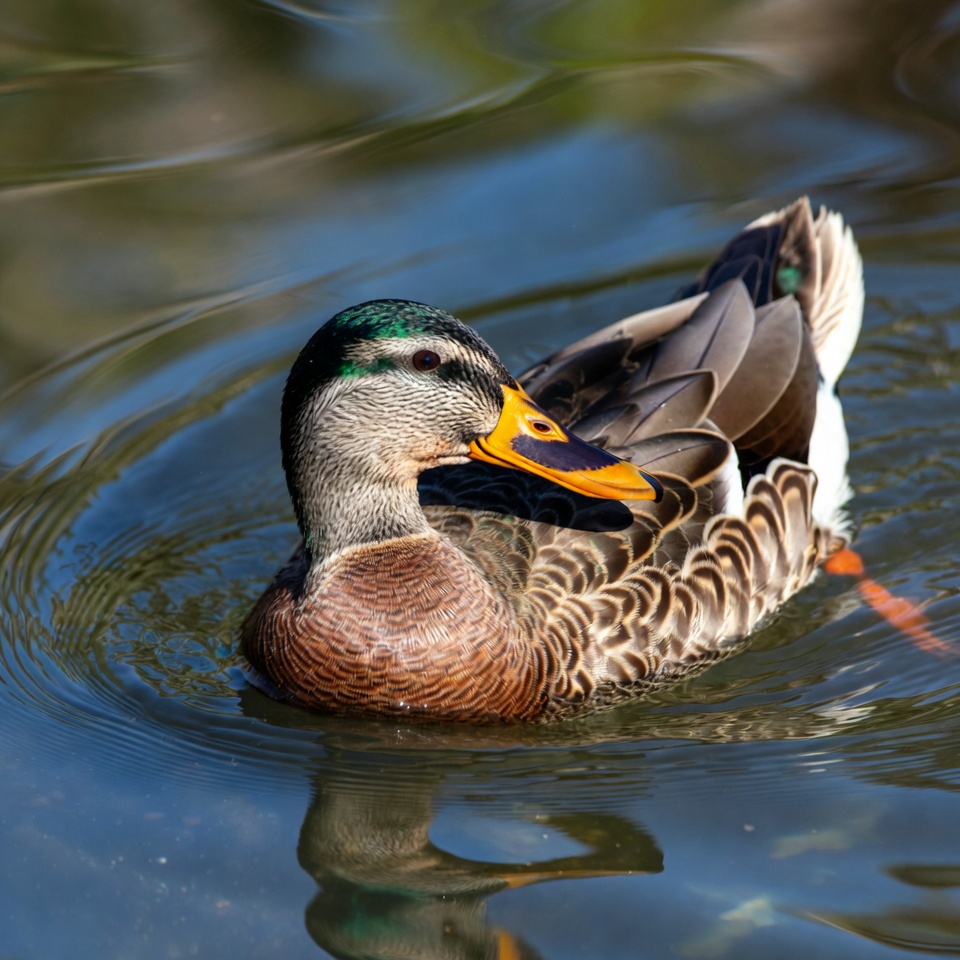 bird, blue water, brown chest, duck reflection, feathers, green head, male duck, nature, orange feet, pond water, swimming duck, water bird, wildlife, wings, yellow bill, mallard duck