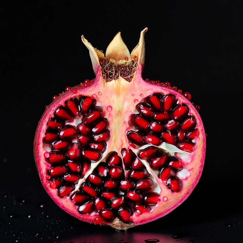 A ripe pomegranate is sliced open, revealing clusters of vibrant red arils inside. The fruit sits on a glossy black surface with small droplets of juice scattered around. The outer skin shows a dried crown-like top.