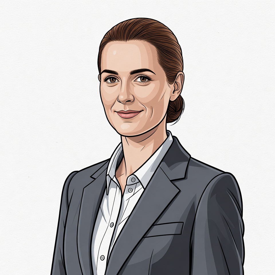 A vector illustration of a woman with brown hair in a neat bun smiles at the viewer. She wears a gray blazer over a white collared shirt. The image is on an isolated white background.