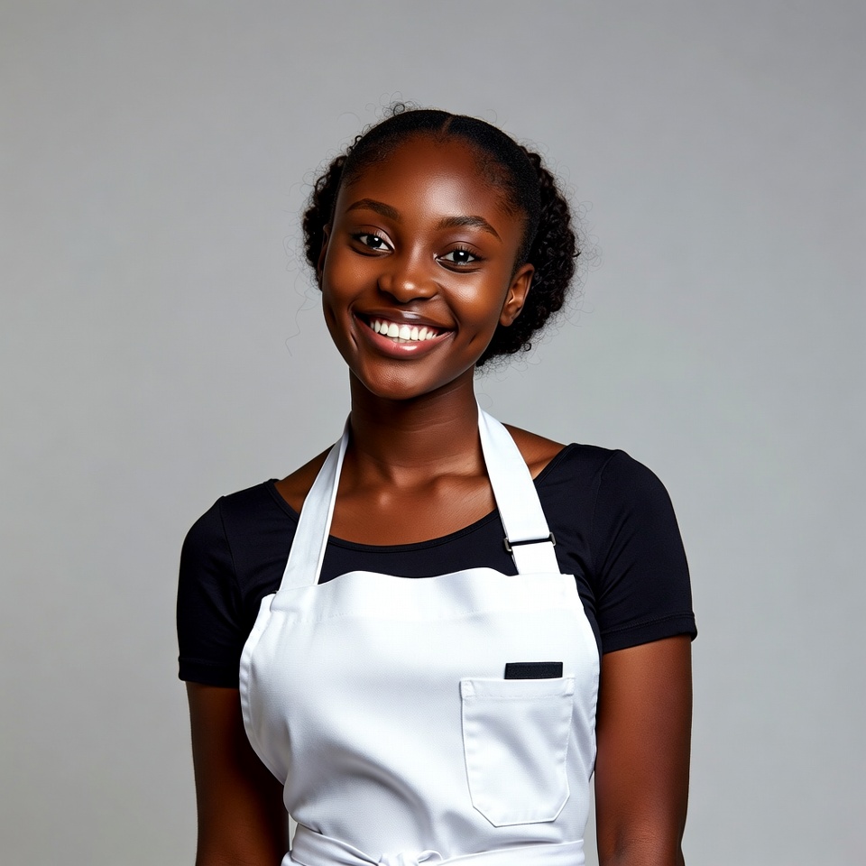 A young African-American woman with curly hair styled in a bun smiles warmly at the camera. She wears a white apron over a black top and stands against a plain gray background. Her expression is joyful and confident.