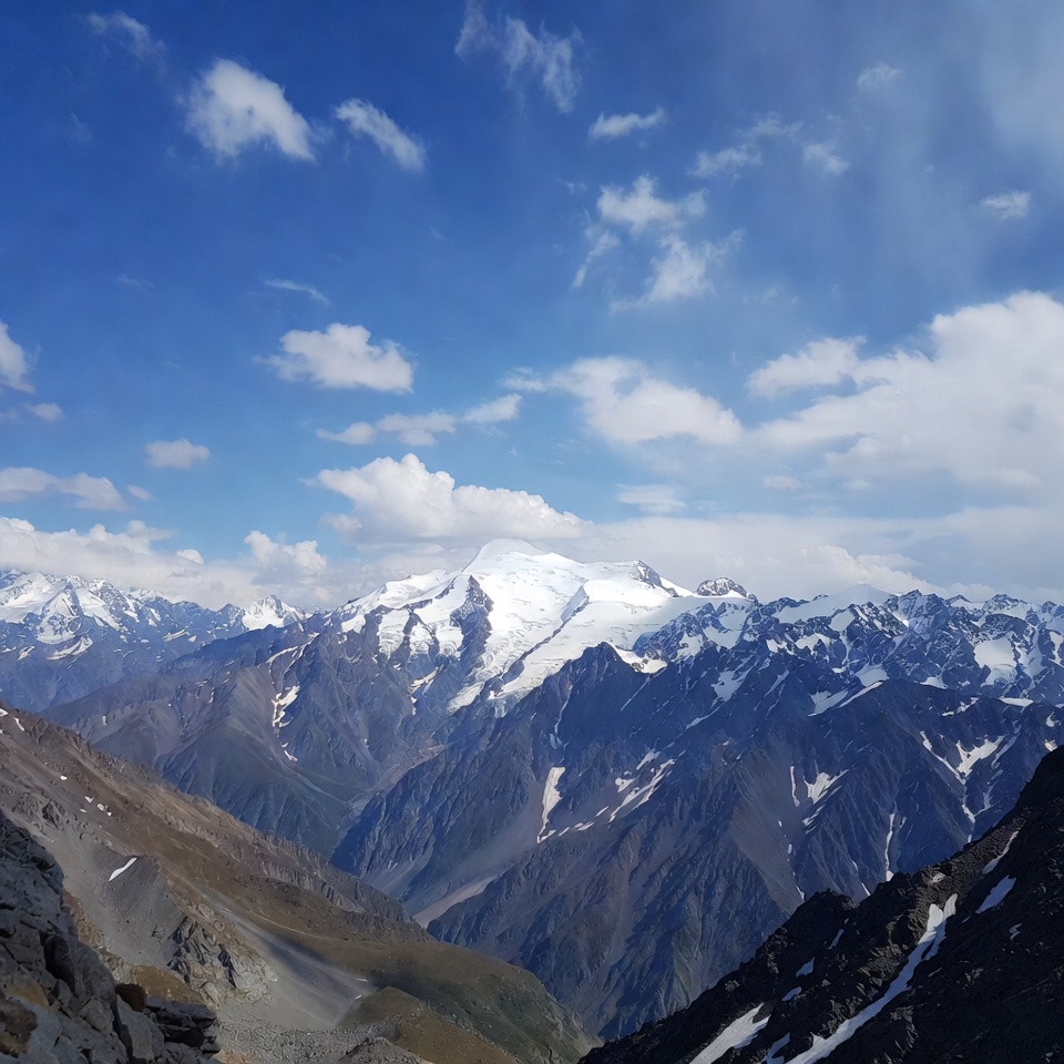 alpine landscape, blue sky, clear sky, clouds, dramatic peaks, glacier, high altitude, hiking view, mountain range, nature, outdoors, panorama, rocky ridges, rugged terrain, scenery, snow-capped mountains, snowy peaks, valley, white snow, mountains