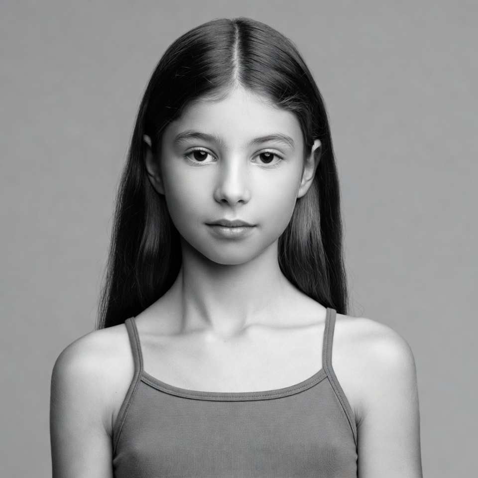 black and white, child, close-up, dark hair, face, female, gray background, headshot, long hair, monochrome, neutral expression, portrait, shoulders, spaghetti straps, straight hair, studio photo, tank top, young girl, girl
