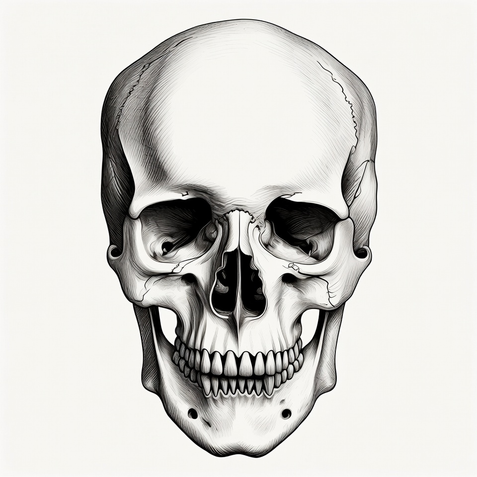 anatomical illustration, anatomy, black and white, bone structure, cranium, detailed drawing, eye sockets, human anatomy, isolated skull, jawbone, medical illustration, nasal cavity, realistic skull, skeleton, skull, skull art, skull illustration, teeth, white background, human skull