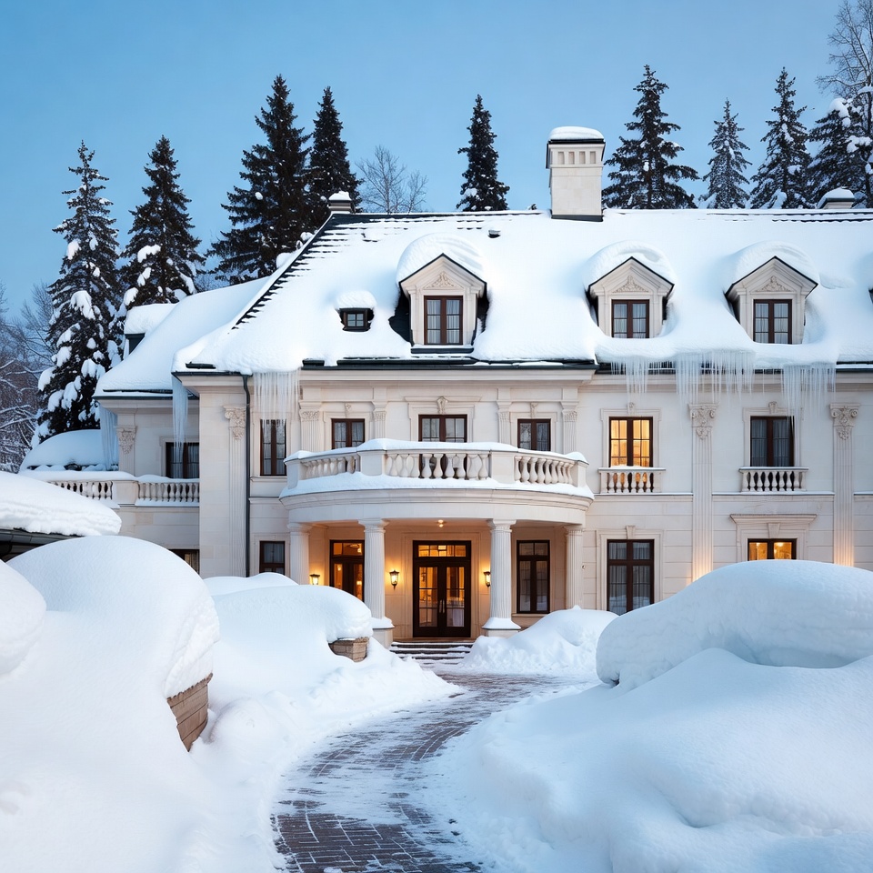 architecture, balcony, cold weather, dormer windows, driveway, estate, evergreen trees, frozen, grand entrance, house, icicles, luxury home, outdoor scene, pine trees, residential building, snow, snow drifts, snowy roof, twilight sky, white exterior, winter, mansion