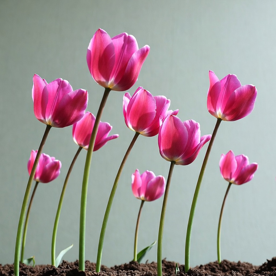 A cluster of vibrant pink tulips stands upright with long green stems emerging from dark soil. The flowers feature pointed petals in shades of magenta and pink against a light gray background. Several leaves are visible at the base near the soil.