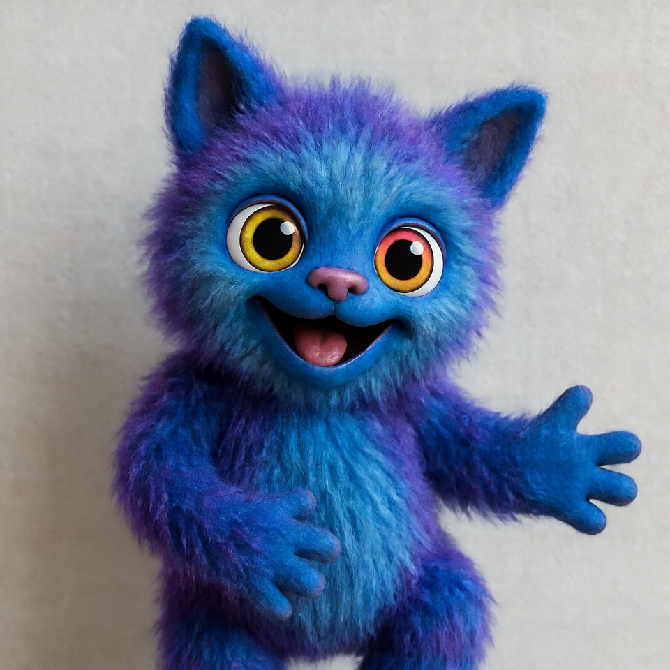 A cute purple fluffy cat with big yellow eyes and a wide smile stands on a white background. It has fuzzy fur, pointed ears, and pink nose. The cat raises both paws in a cheerful waving gesture.