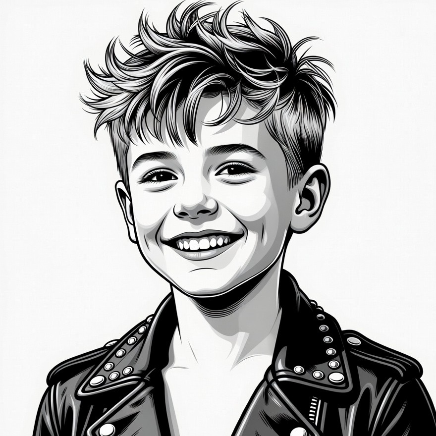 A young boy with spiky hair smiles happily in a detailed black and white illustration. He wears a studded leather jacket with the collar open. The portrait is rendered in a bold line art style on a white background.
