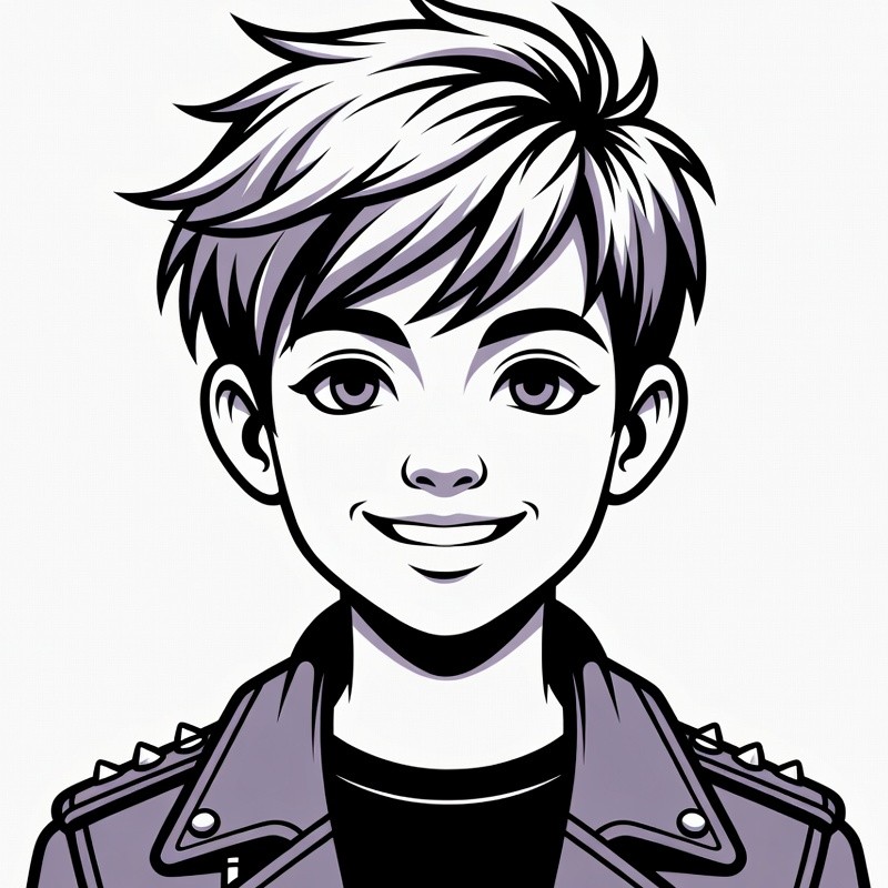 A cartoon illustration of a young boy with spiky white hair and large expressive eyes smiles happily. He wears a purple leather jacket adorned with silver studs over a black shirt. The image features bold black outlines and a transparent background.