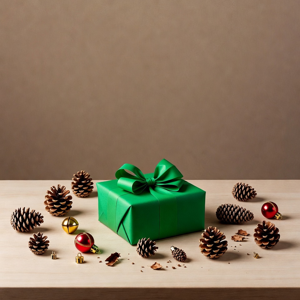 A vibrant green gift box with a large matching bow sits centered on a wooden table. It is surrounded by scattered pine cones, red and gold Christmas ornaments, and small bells. The neutral beige background highlights the festive holiday arrangement.