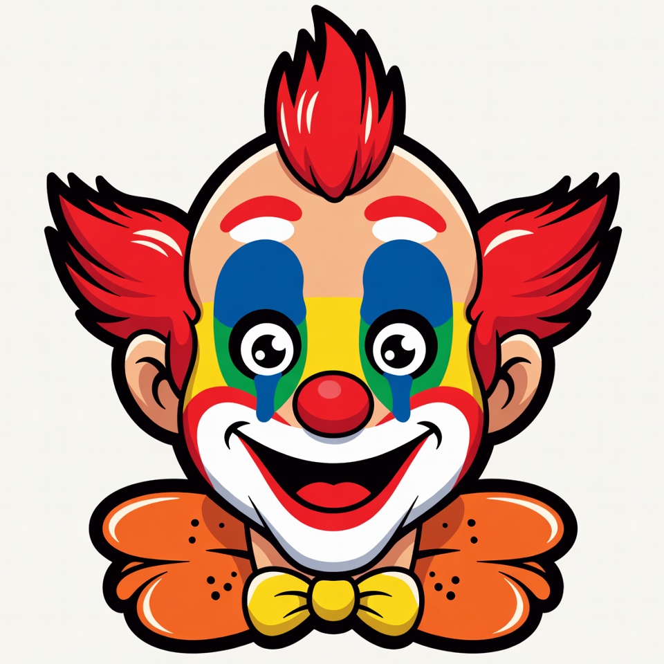 A vibrant cartoon clown face features bright red spiked hair, multicolored makeup with blue eyelids and yellow accents, and a large red nose. The clown has a wide smiling mouth revealing teeth and expressive eyes. It wears an orange collar with a yellow bowtie on an isolated white background.