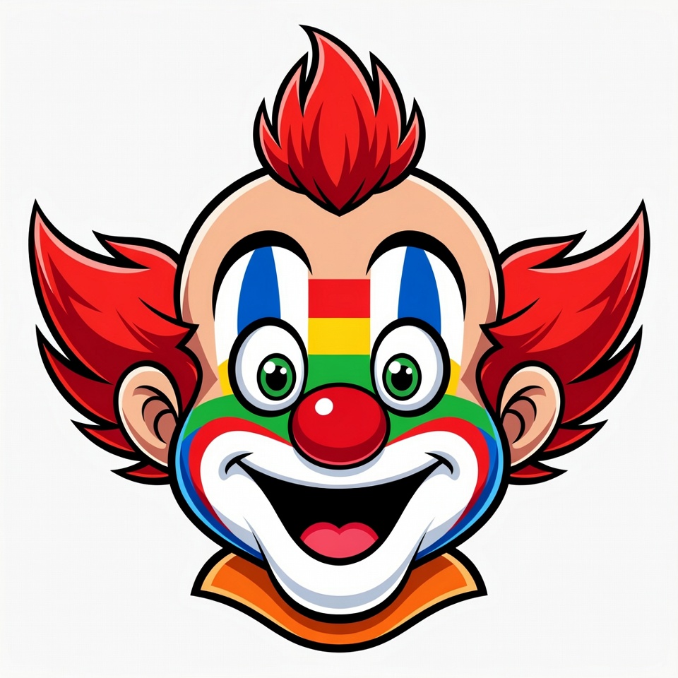 big smile, cartoon character, cartoon clown, circus clown, clipart, clown face, colorful makeup, fun clown, googly eyes, illustration, isolated background, rainbow cheeks, red hair, red nose, smiling clown, spiky hair, striped eyes, vector art, vibrant colors, white background, clown