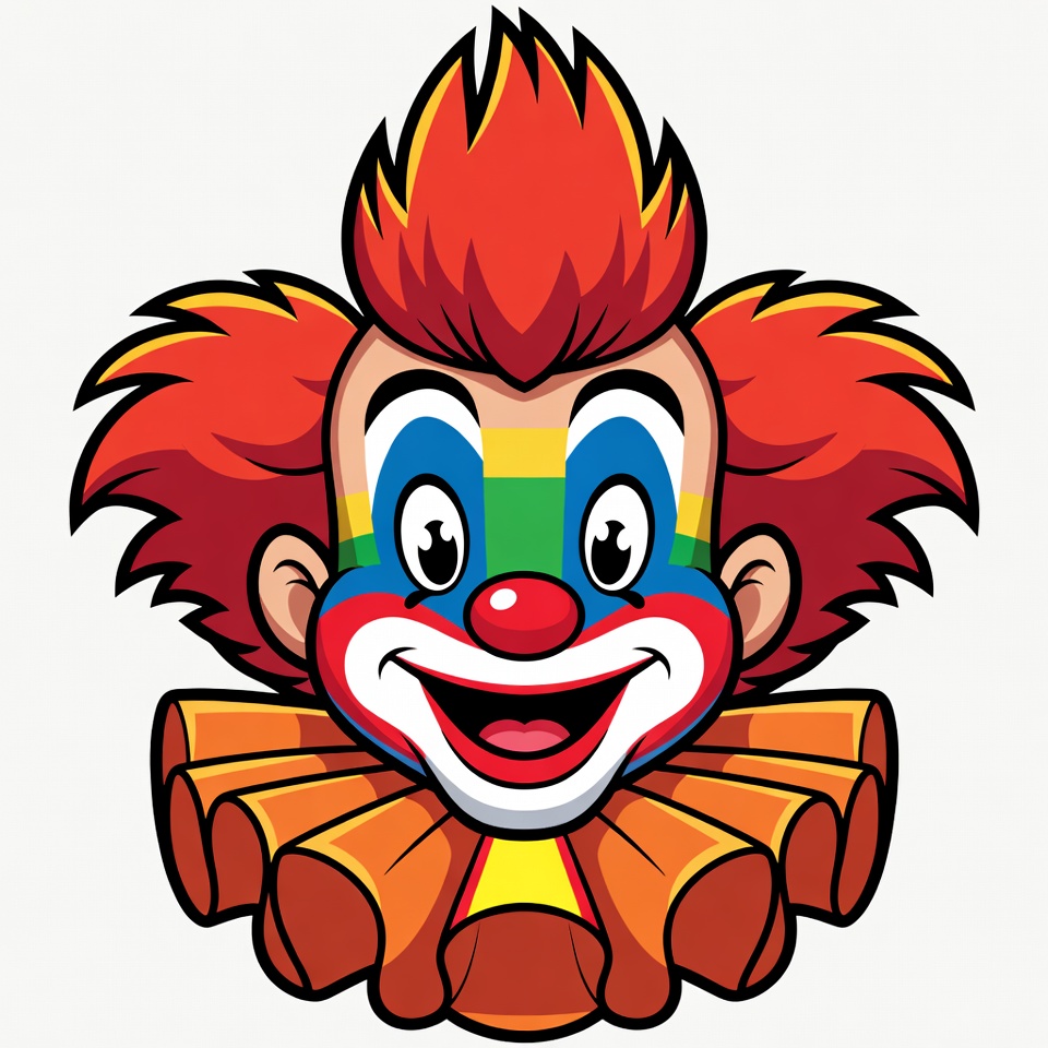 big smile, blue eyes, cartoon clown, circus clown, clipart, colorful clown, face paint, fun clown, happy face, illustration, isolated background, orange collar, rainbow makeup, red hair, red nose, ruffles, smiling clown, vector art, clown
