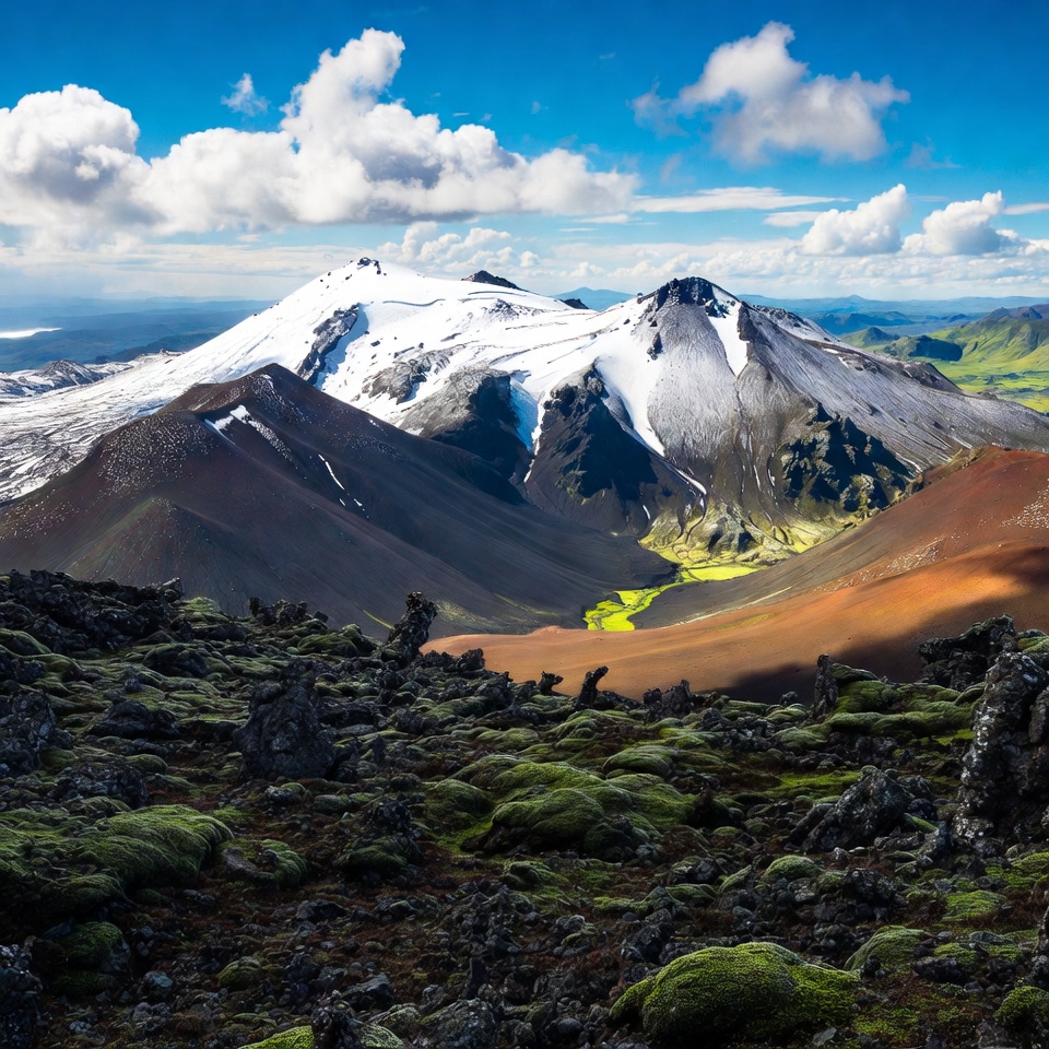 Snow-covered volcanic mountains rise dramatically under a bright blue sky with scattered white clouds. A vibrant green valley winds through dark lava fields and colorful ash slopes in the foreground. Moss-covered rocks dot the rugged terrain leading to the majestic peaks.
