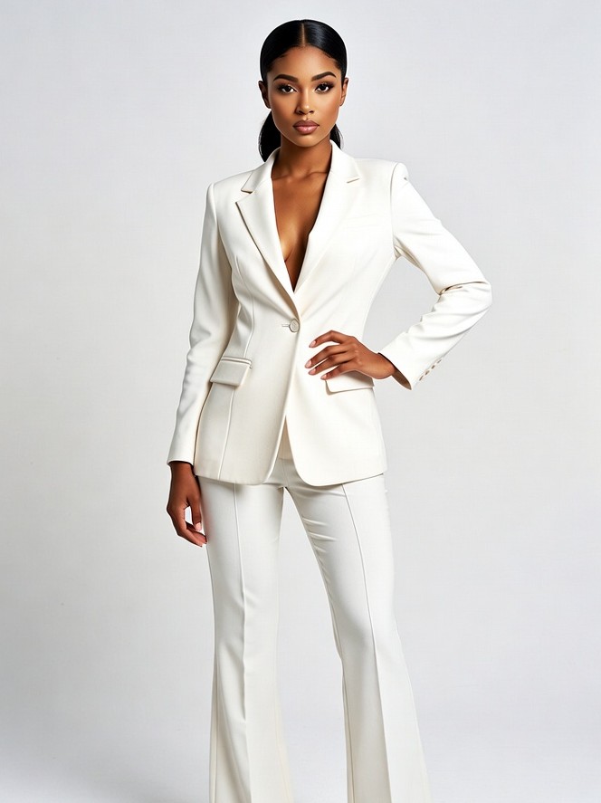 A beautiful African-American woman with long dark hair in a ponytail stands confidently wearing a white blazer and flared pants suit. She has one hand on her hip and poses against a plain background. The suit features a deep V-neckline and tailored fit.