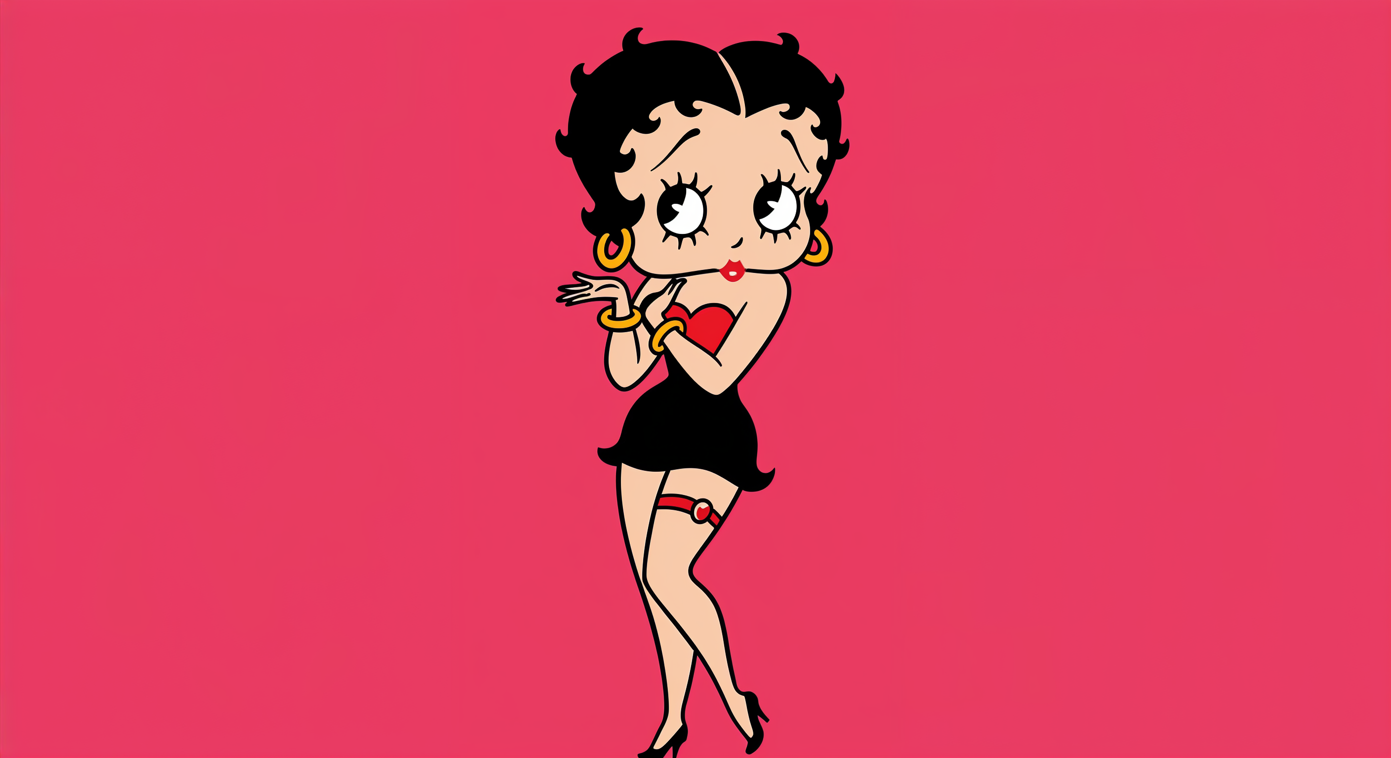 animated character, big eyes, black dress, cartoon, clipart, curly hair, female, gold earrings, high heels, illustration, isolated background, pink background, playful, red lips, standing pose, vintage cartoon, woman, Betty Boop