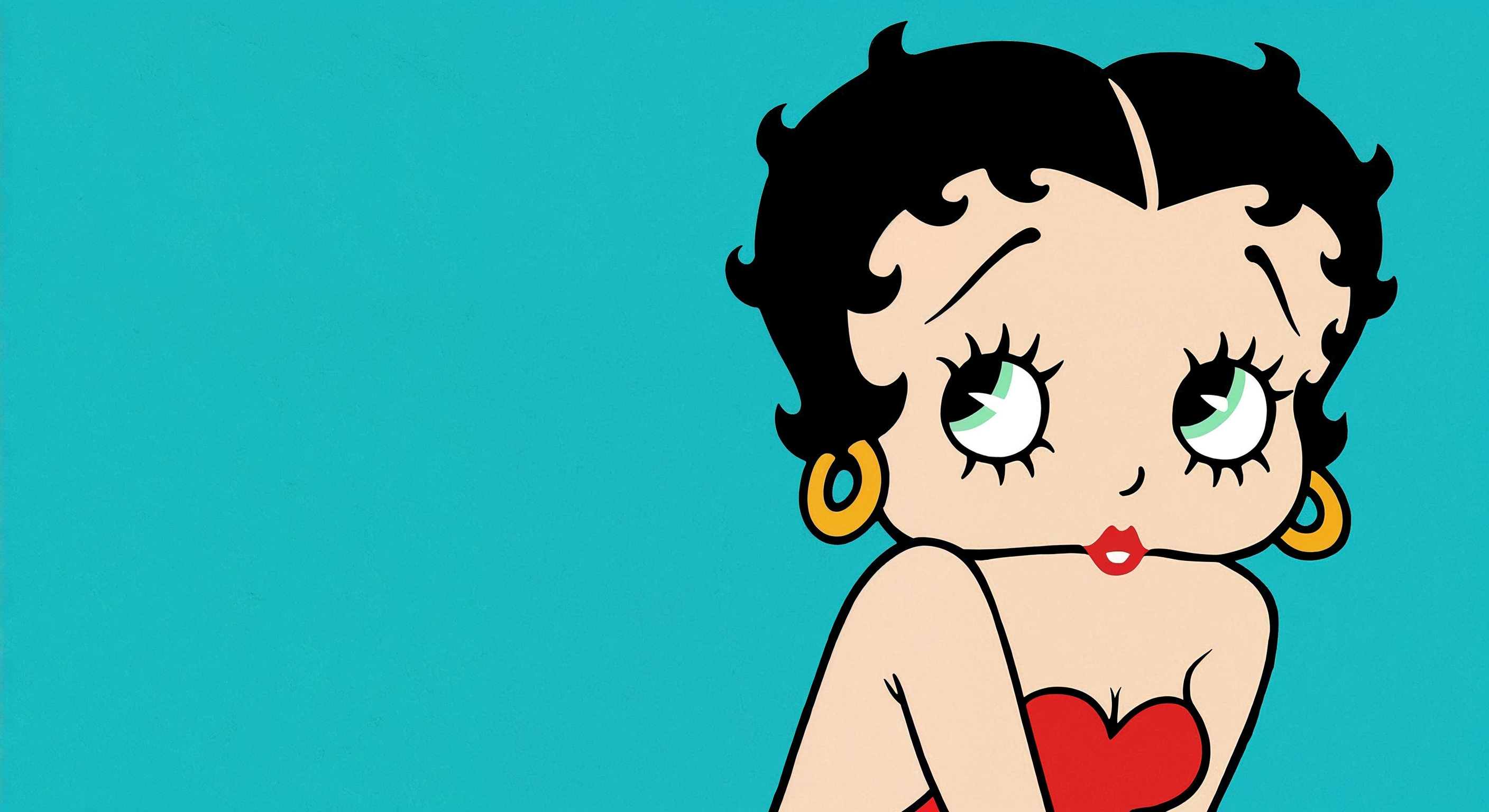 Betty Boot, the iconic cartoon character, faces sideways with large green eyes and black curly hair. She wears a red strapless dress, gold hoop earrings, and rests her chin on her hand. The illustration is set against a solid turquoise background.