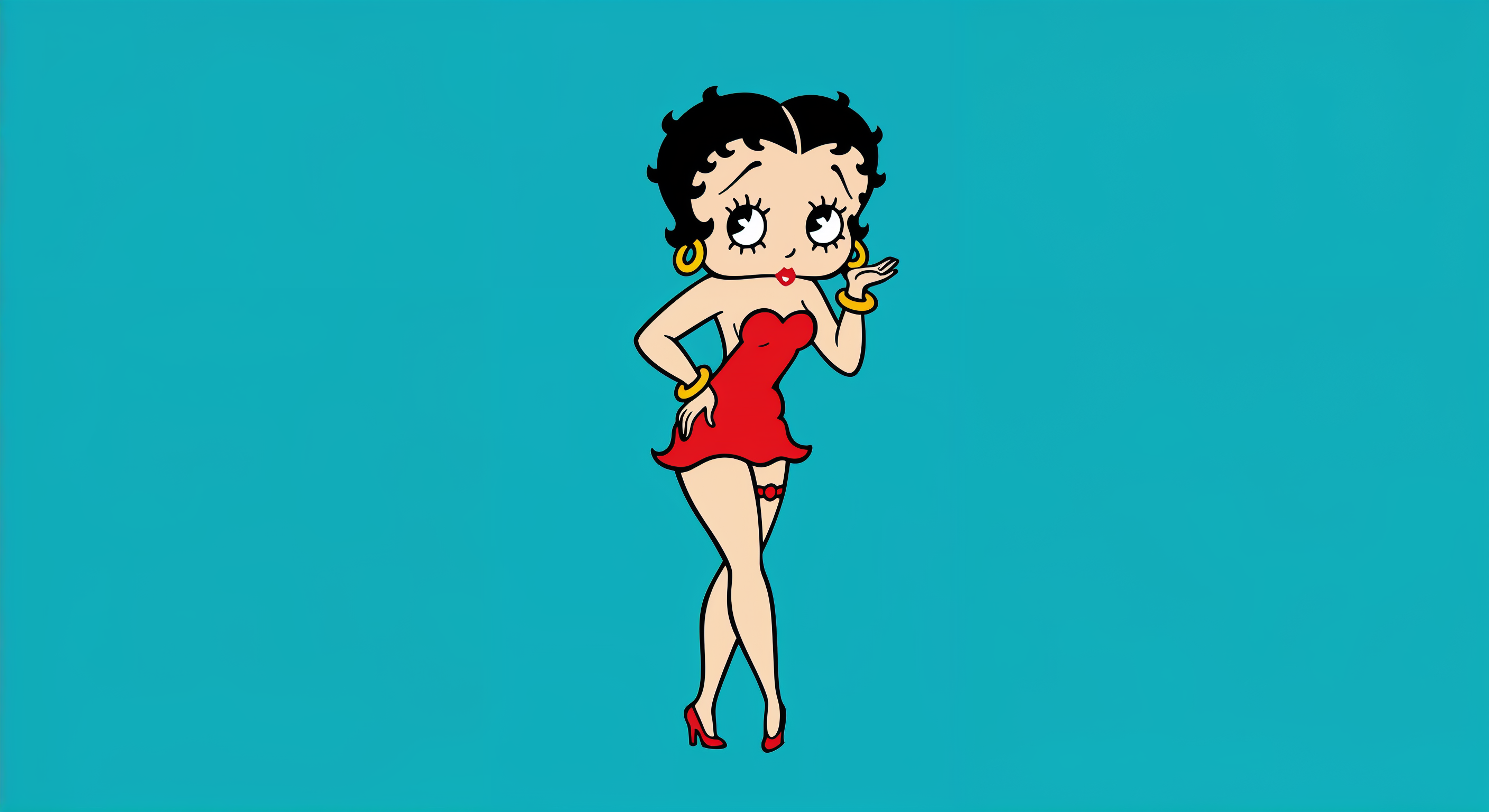 animated character, bangles, big eyes, black hair, bob hair, cartoon, clipart, female, high heels, illustration, isolated background, red dress, red lips, sexy pose, standing pose, turquoise background, vintage cartoon, woman, Betty Boop
