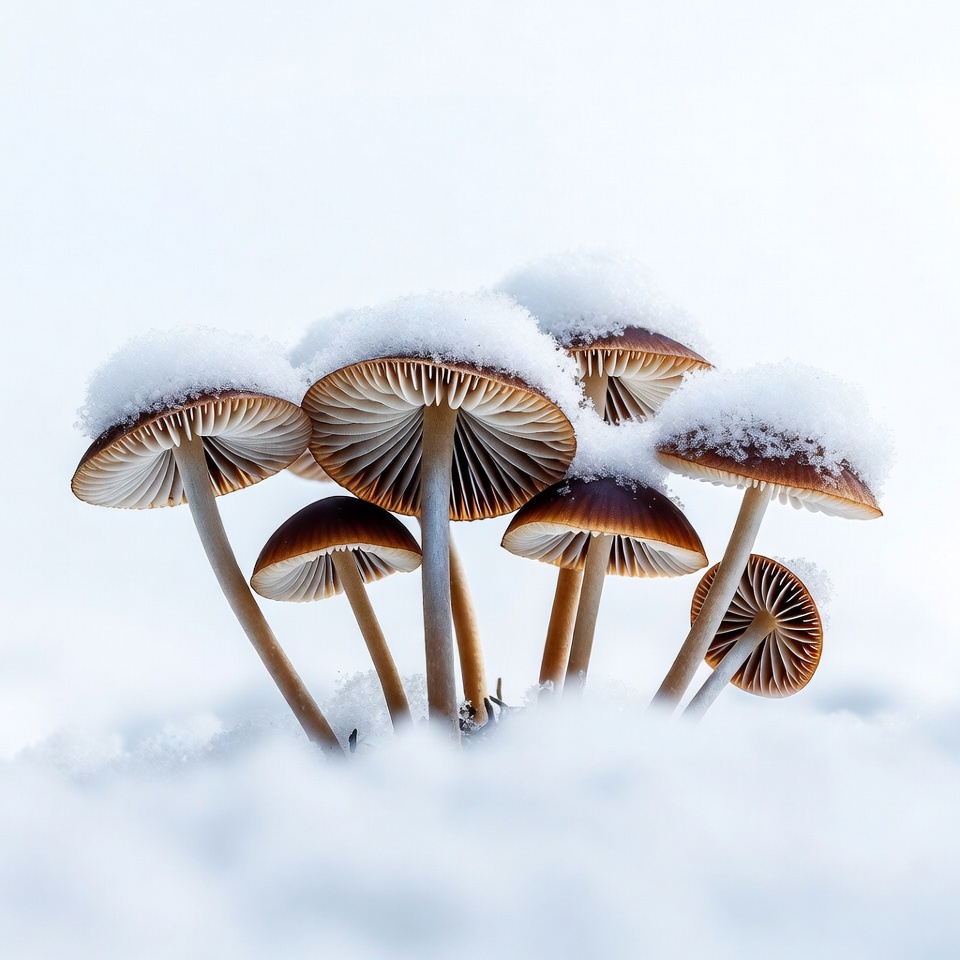 brown caps, cluster, forest mushrooms, fungi, isolated, macro, nature, snow, snow-covered, snowy mushrooms, toadstools, white background, white stems, winter fungi, mushrooms