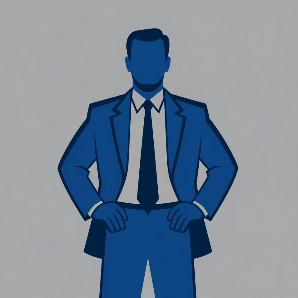 A blue silhouette illustration of a man standing confidently with hands on hips. He wears a suit, white shirt, and tie on a gray background. The vector graphic features a simple, flat design.