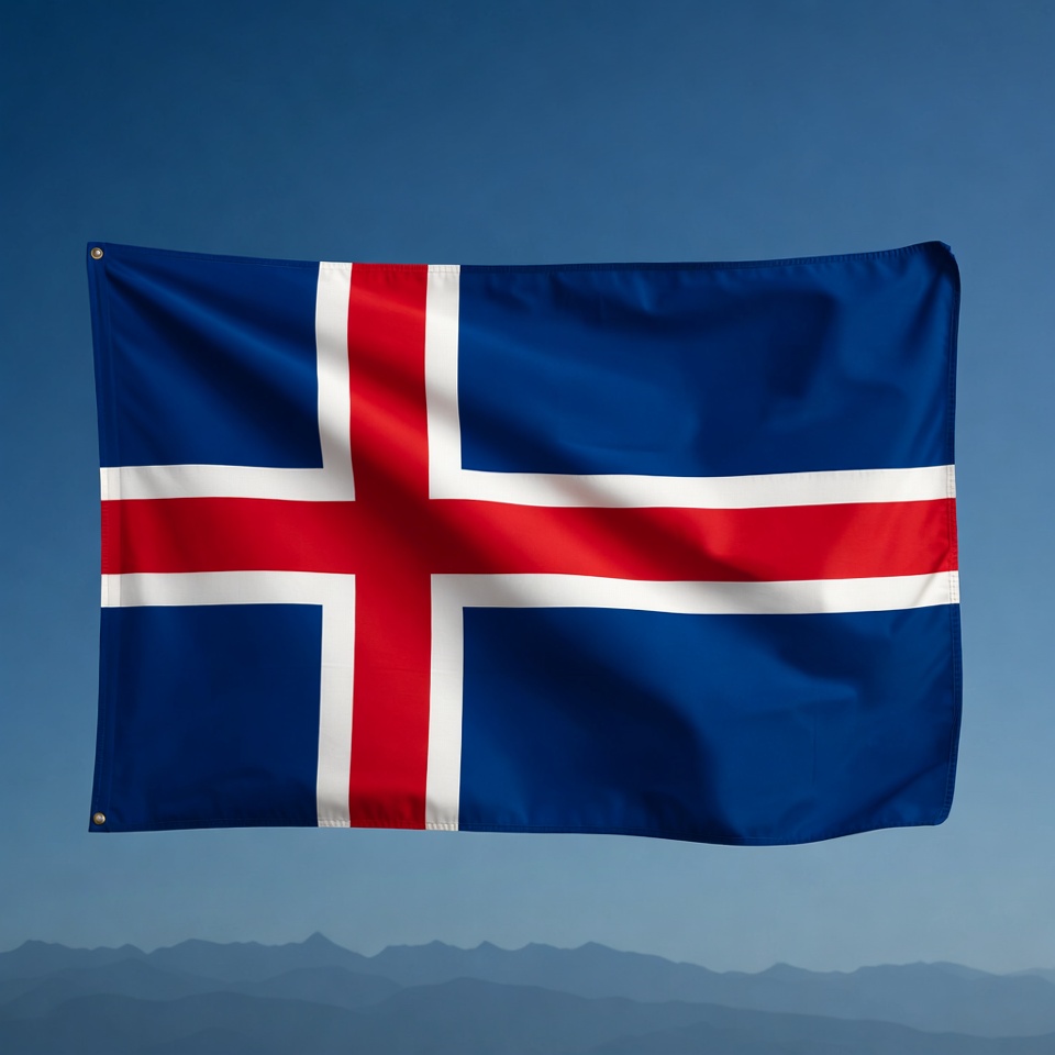 A blue flag with a red Scandinavian cross centered on a white background waves gently against a clear blue sky. The flag is hung from a pole and positioned above distant snow-capped mountains. The design features the iconic Nordic cross symbolizing Iceland.