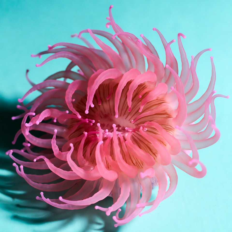 A vibrant pink sea anemone with numerous flowing tentacles is centered against a bright turquoise blue background. The anemone features translucent pink and white tentacles radiating outward from a central oral disc. Subtle shadows enhance its three-dimensional appearance.