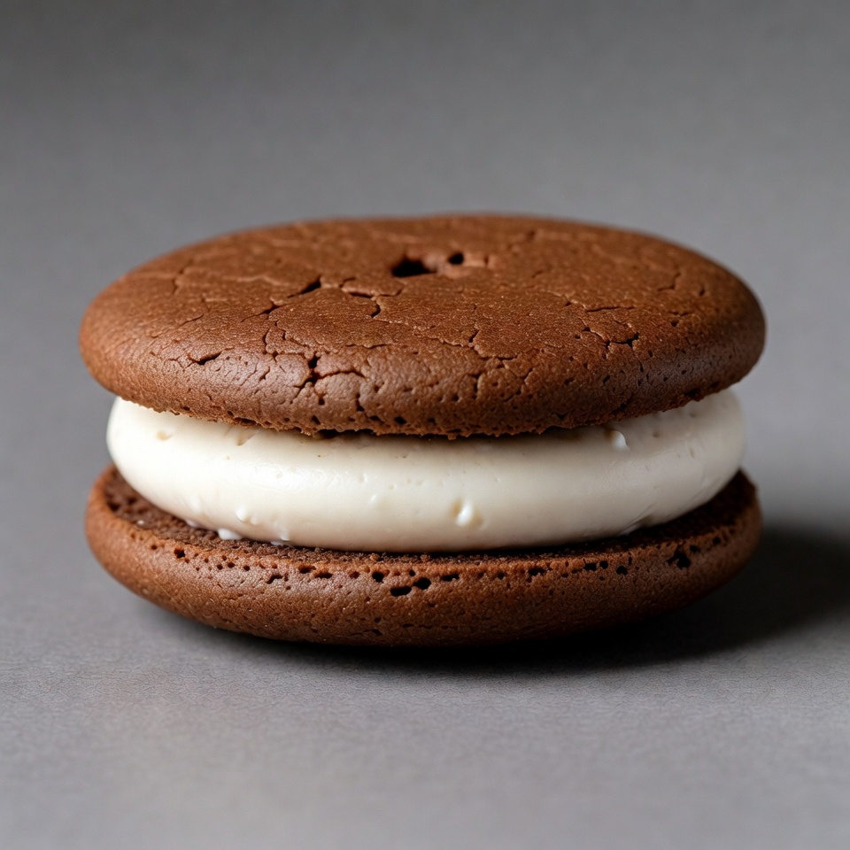 A chocolate whoopie pie features two soft, cracked brown cookie rounds sandwiching thick white cream filling. It sits centered on a plain gray background. The texture highlights the rough, baked surface of the cookies and smooth cream.