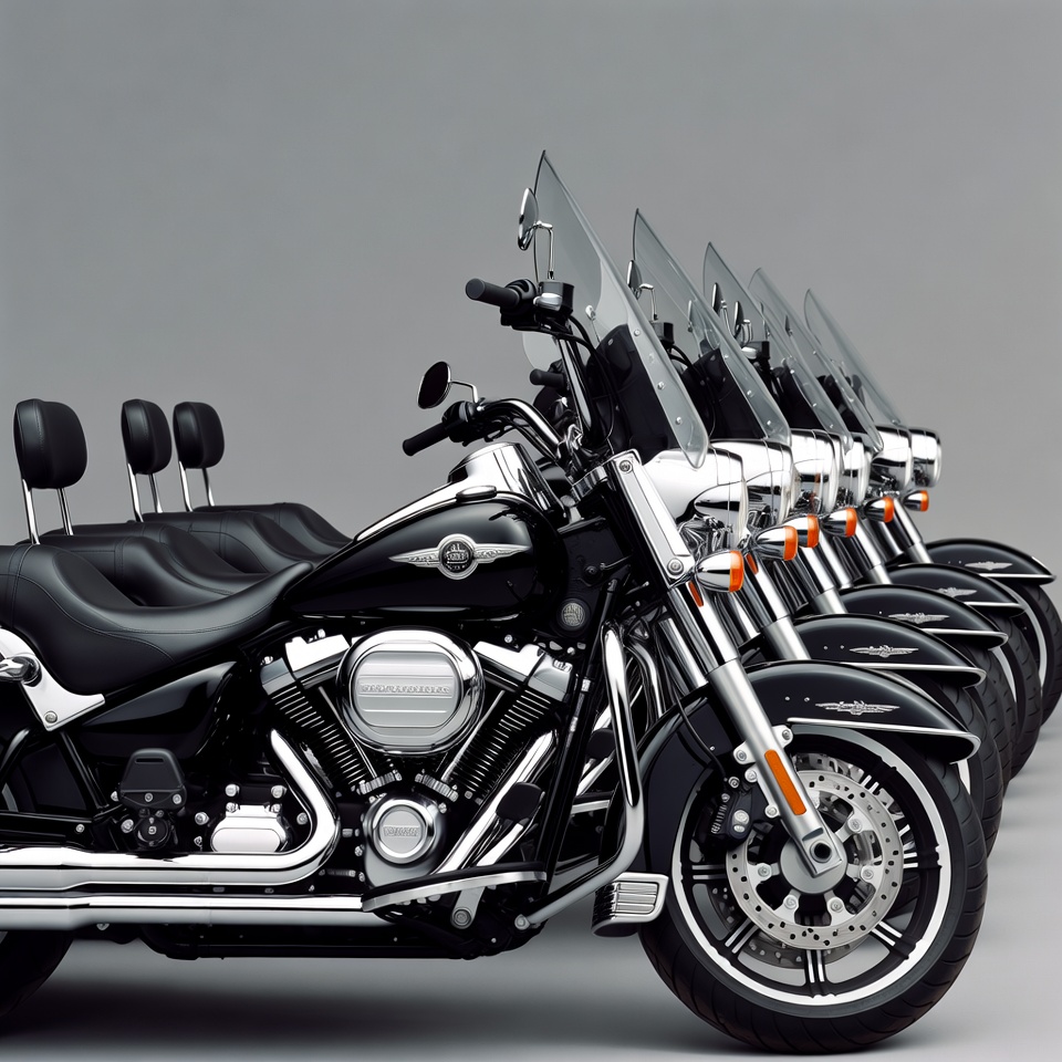 Harley bikes, backrest, bike fleet, black motorcycle, chopper, chrome accents, cruiser motorcycle, gray background, leather seat, motorbike, motorcycle, motorcycles lineup, row of bikes, touring bike, turn signals, vehicle, windscreen, Harley-Davidson