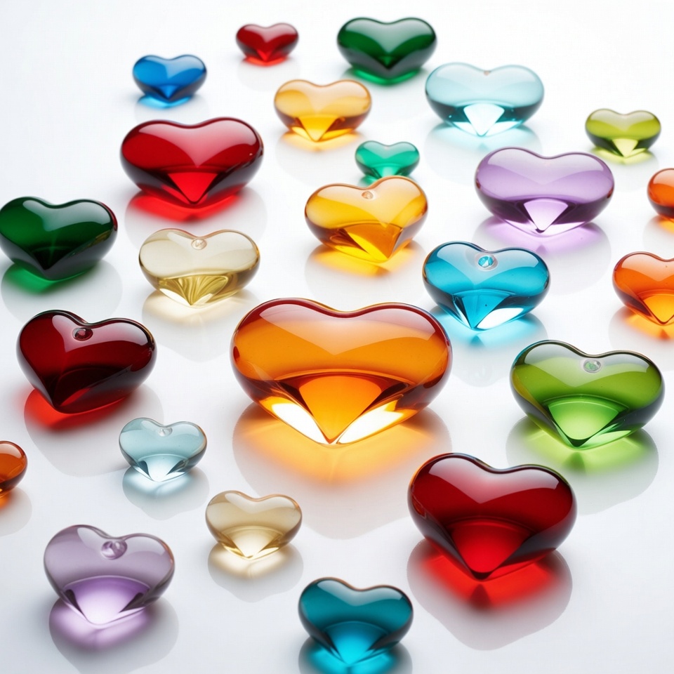 art object, blue hearts, colorful hearts, crystal hearts, decorative hearts, glossy hearts, green hearts, heart shapes, orange hearts, purple hearts, red hearts, reflections, scattered hearts, shadows, shiny hearts, translucent hearts, vibrant colors, white background, yellow hearts, glass hearts