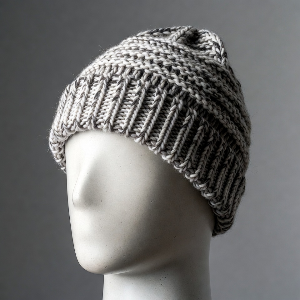 beanie hat, cable knit, fashion accessory, gray hat, headwear, isolated background, knit hat, mannequin head, slouchy beanie, textured knit, white hat, winter hat, wool hat, knitted beanie